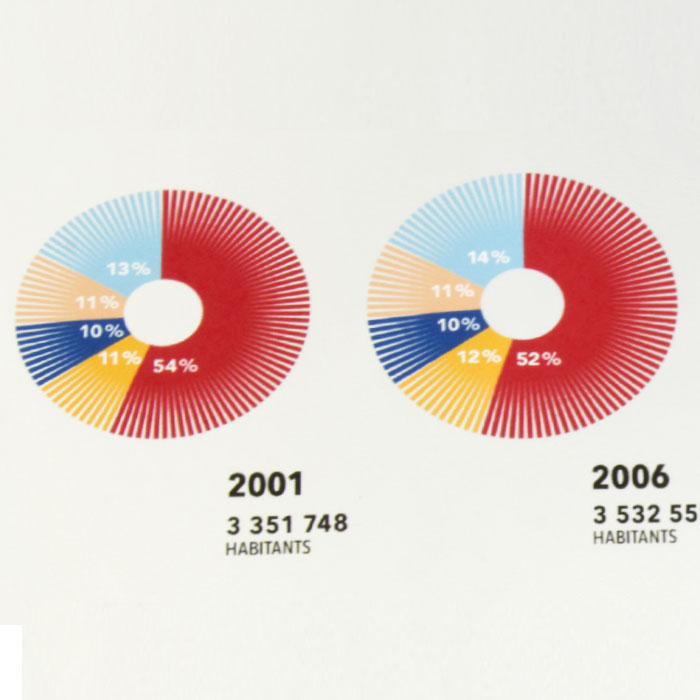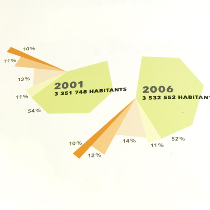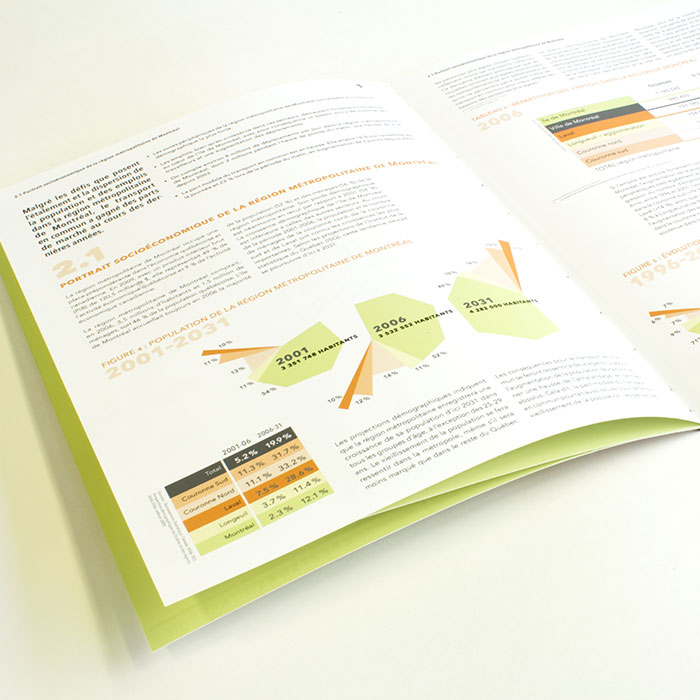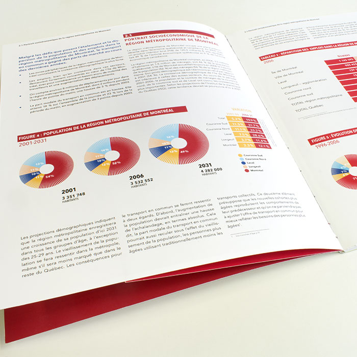 Réalisation d’un cahier tête-bêche en 2 concepts pour la chambre de commerce de Montréal présentant les résultats d'une étude sur le transport en commun.